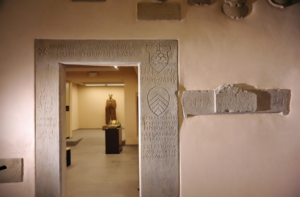 La datazione dell’edificio è complessa dal momento che non esistono pubblicazione specifiche sul Palazzo Pretorio. Il Niccolai nomina il palazzo fra i fabbricati più antichi che si affacciano sulla piazza insieme al loggiato mediceo senza riportare però alcuna datazione. Attraverso l’analisi degli stemmi e delle inscrizioni che adornano la facciata e l’interno del palazzo si può ipotizzare che i lavori di costruzione dell’edificio non siano stati completati prima del 1536. Il documento più antico risale al 1834, redatto dal’Ing. Giuseppe Verghe, che fa riferimento alla necessità di operare sul consolidamento dei solai. In un secondo documento, datato 1842 e redatto dall’Ing. Tommaso Lepori, si evince che furono effettuati lavori di importanza sulla facciata della piazza e che fu realizzato, al piano soffitte, un secondo piano abitabile. Nel 1850 segue il progetto redatto dall’Ing. Romoli che prevedeva di aumentare gli spazi interni, realizzando una stanza terrena e una cucina sopra a tetto, ricavandoci il quartiere per i Reali Gendarmi. L’immobile, utilizzato in anni recenti come depositeria comunale, versava in uno stato di semi abbandono e ad oggi sono previsti una serie di interventi atti a restituire alla comunità un edificio di rappresentanza per la pubblica amministrazione, inserendo al suo interno spazi espositivi e di accoglienza, uffici per la giunta e sala polivalente.